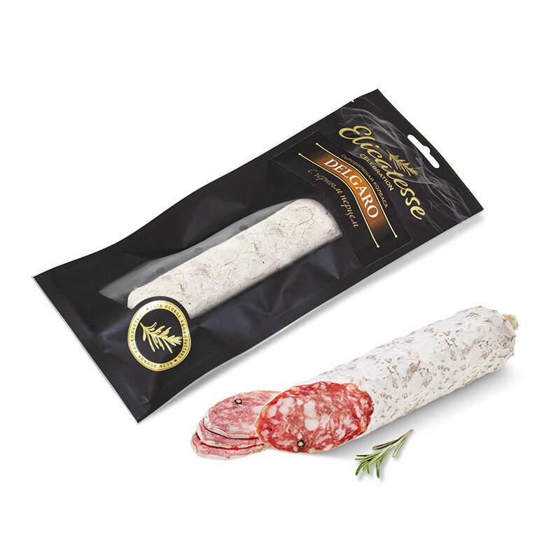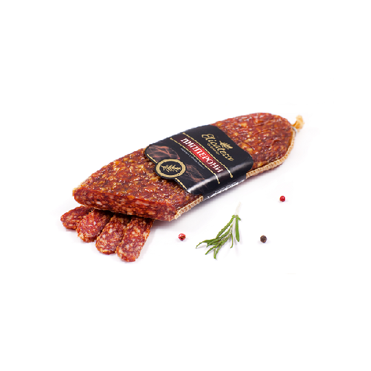 Сырокопченая колбаса для любителей остренького. Изготовлена преимущественно из говядины высшего сорта, с добавлением отборной свиной грудинки, шпика и специй, которые придают остроту и оригинальный вкус. В состав входят четыре вида перца: черный, белый, розовый и зеленый.
