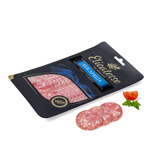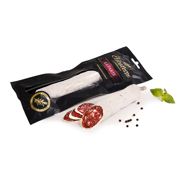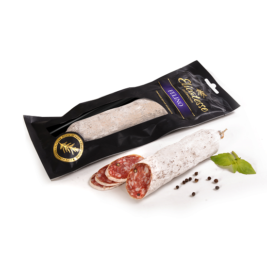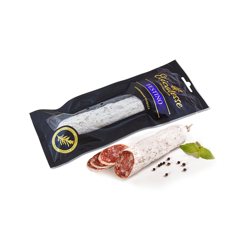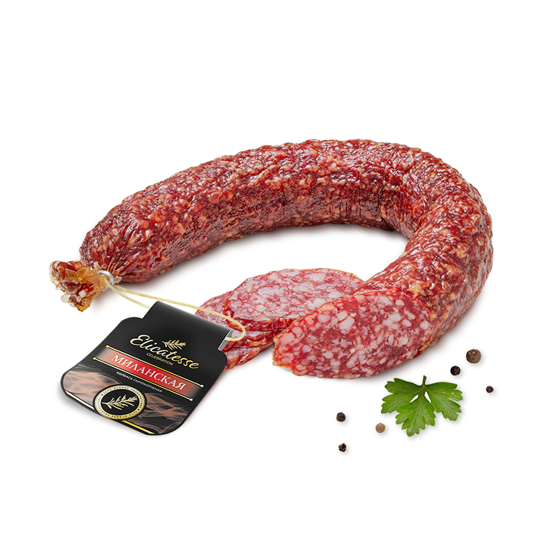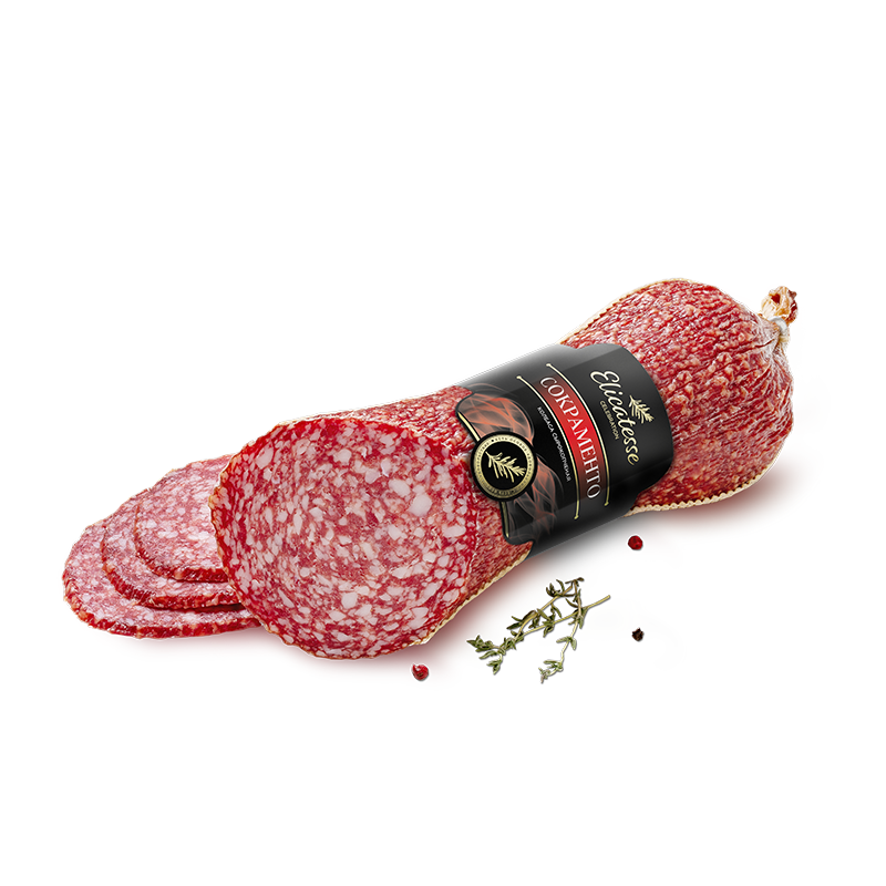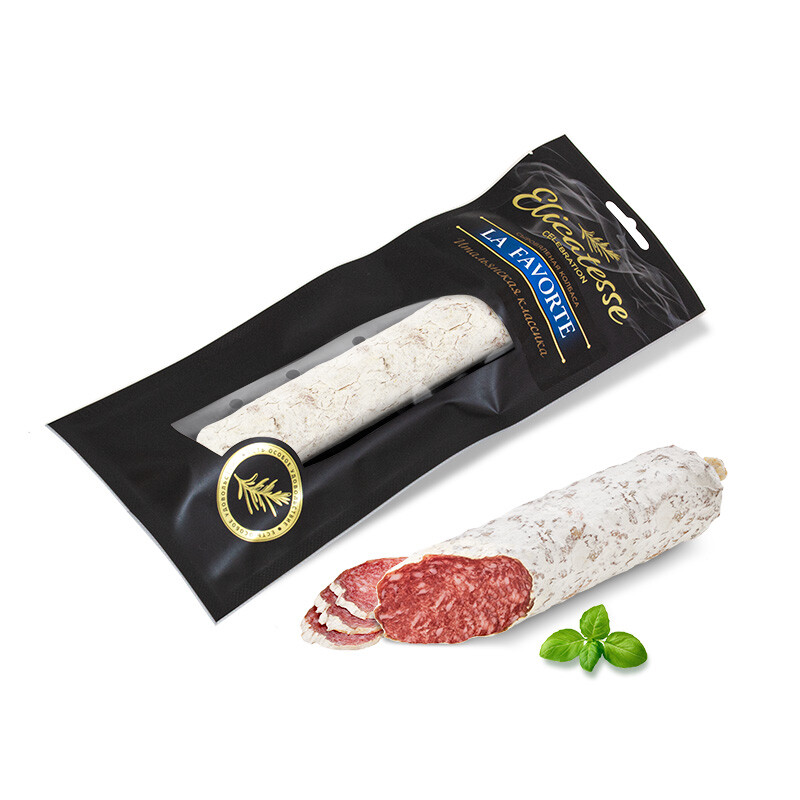 Изготовлена по итальянским рецептам из деликатесной говядины и свинины с добавлением мелкого шпика, который превосходно смотрится на срезе. Благодаря букету ароматных специй имеет особый выдержанный вкус, который не оставит равнодушным никого. Упакована в формате нарезки.